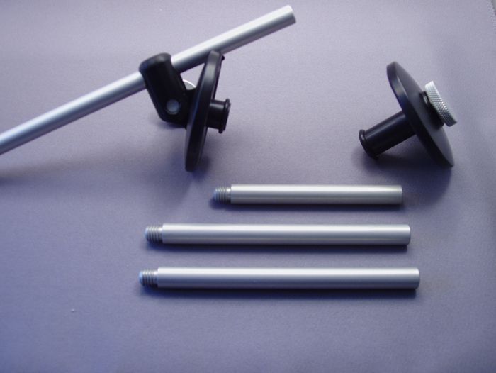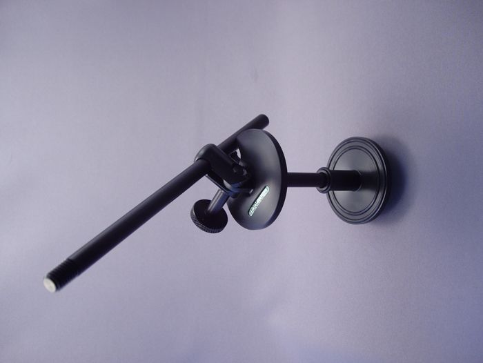 The clamp consists of two discs, with embedded nitrile rings to cushion and protect, which are drawn together by a thumbscrew to acquire an extremely tenacious grip on the edge of the instrument, where it is strongest. The boom has a standard 3/8 inch thread for attaching clips or shock mounts, not included, to suit the chosen microphone or other device.