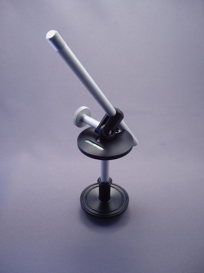 The clamp consists of two discs, with embedded nitrile rings to cushion and protect, which are drawn together by a thumbscrew to acquire an extremely tenacious grip on the edge of the instrument, where it is strongest. The boom has a standard 3/8 inch thread for attaching clips or shock mounts, not included, to suit the chosen microphone or other device.